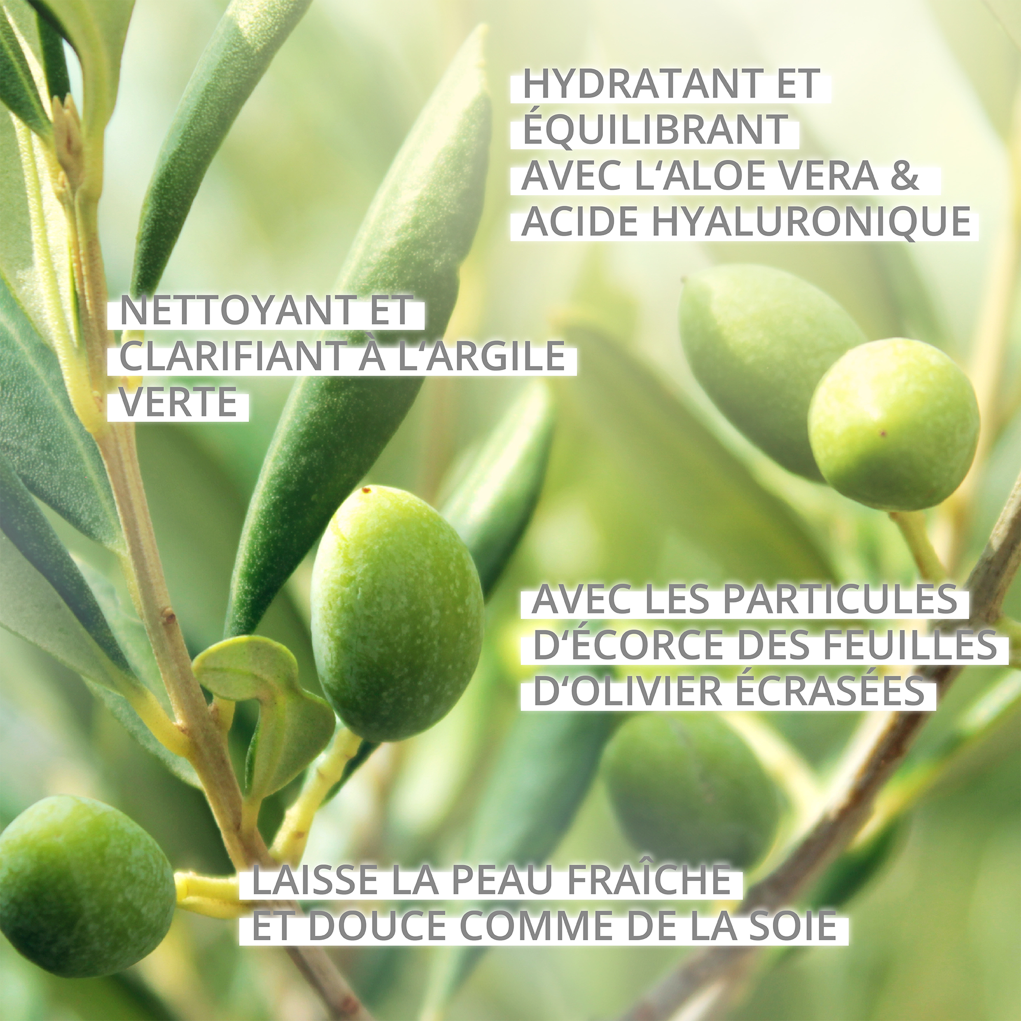 2) Le masque contenant des feuilles d’olivier froissées, un massage en douceur après le temps d’action vous permettra d’obtenir un léger effet de gommage. Pour une peau encore plus lisse après l’application.